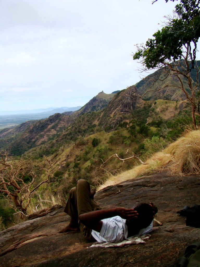 Shaktivel, a forest guard, told us of the time when he was scaling this very same peak (that we were trekking) with Karrapuayya, a local, a few years back. As members of the Anti-Poaching Watchers (APW) squad, they were scouting for any illegal activity that may be happening in the peaks. It was around mid-day when they heard some sawing and crunching noise from one area. Karrapuayya who knew the forest well, asked Shaktivel to come from one side and he himself would enter from the other side, thus surrounding the source of sound. Karrapuayya was correct in guessing that there were timber smugglers in that location and they were cutting down trees from the reserve without permission. On carefully and silently reaching the place, armed with nothing but their sticks, Shaktivel and Karrapuayya sprang at the two men who were logging down the tree. Seeing them, the two smugglers fled. A chase followed and the smugglers were out-running the forest guards.