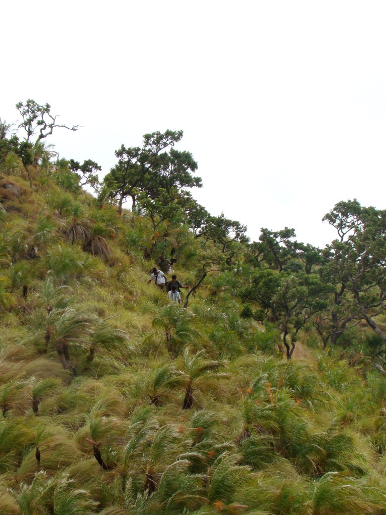 I did not find the incline dangerous, since there was plenty of vegetation to hold on to while getting down. It was the wind that concerned me. We used to walk a few steps and then sit down to let the gust pass. After an hour, we bid farewell to Ganesan and Murugan. The next 3 hours involved us battling the very raw forces of Nature. I cannot even describe what wind speeds we experienced here! All I could think of was- Maybe this is what I would feel if I was standing close to a huge exhaust fan! Battling these winds only made me realise more how little we are in front of nature. We are so powerless and helpless when it came to battling nature’s forces. And yet, the things that helped us battle these winds were again because of nature- thanks to the abundant vegetation on that mountain, which was able to bear our weight and grasp. We hung on to blades of tall grass with all our strength each time a strong gust passed.