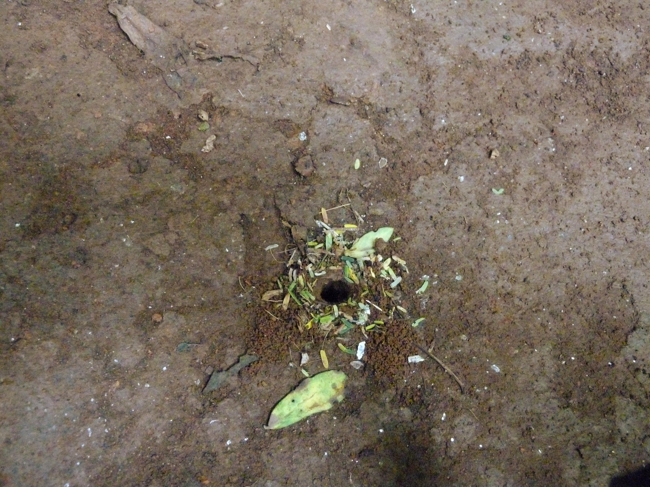 We were walking in the forests of Chorla Ghats (2009) when there was a very small patch of clearing in the top soil. In the middle of that clearing, was a hole. And around the hole, there was a bunch of small leaves, petals and twigs.