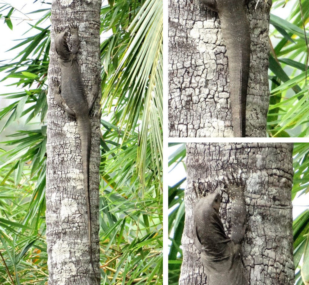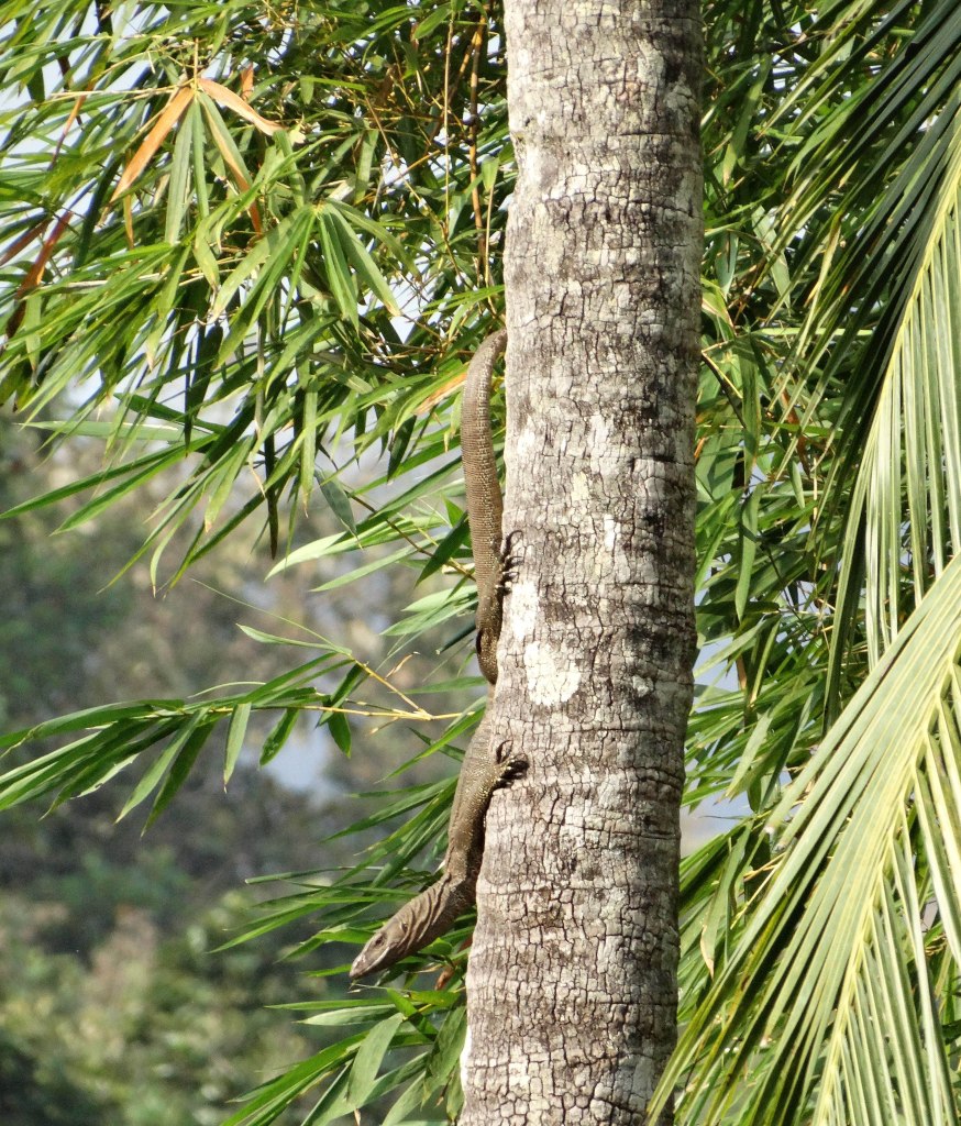 A couple of minutes later, I saw movement again. But this time, the movement was on the tree itself. I got my binoculars out and there I saw it: a gigantic Monitor Lizard making its way up the tree.