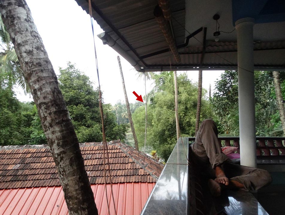 I sat browsing through the pages of my bird field guide. My eyes were almost drooping but I was determined to stay up. Why waste precious day time in sleeping when you are in such a beautiful place, I thought to myself. From the balcony, I could see some coconut trees between me and the stream which was no more than 50 metres away. As I stared out at the quaint scenery from the balcony, I thought I saw some movement near one of the trees. I walked up to the edge of the balcony to get a better look and squinted my eyes to concentrate my view near the foliage surrounding a particular coconut tree. After a few minutes, I thought that perhaps my eyes had played a trick on me. I went back to where I was sitting.