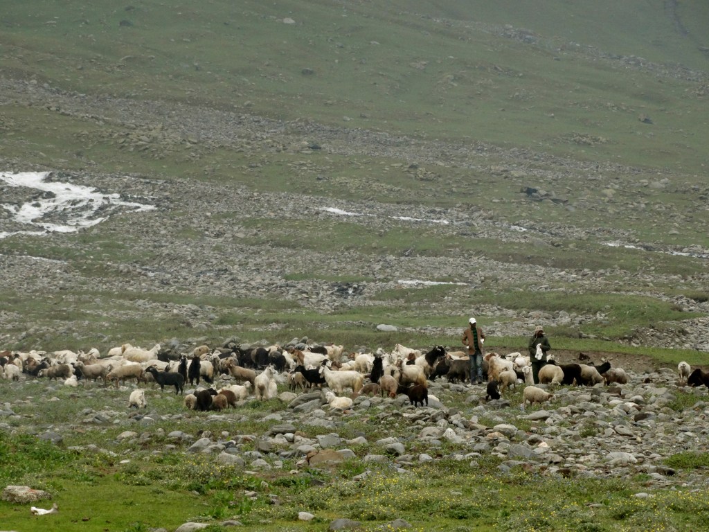 We had just reached Kara campsite at 3pm. The campsite was surrounded by hills on all sides. There were hundreds of goats and sheep grazing in the vicinity. Far away, we could see 3-4 Shepherds and Sheep dogs. We dropped our day packs on the ground and quenched our thirst from the nearby stream. We were just about to set up our tent, when Ashwin offered to get some water from the stream to refill the camp stock. No sooner than he picked up the large plastic transparent jar, he got mobbed by hundreds of goats and sheep! [Video at the end of this post]