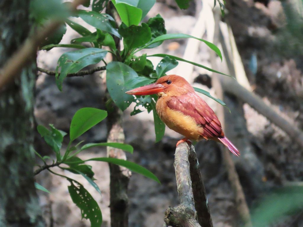 Then comes another favourite, the Ruddy Kingfisher. A mangrove specialist, this bird is perfectly adapted to humid, tangled habitats. Typically seen perched calmly on roots or low branches, it can remain almost hidden until sunlight reveals its rich plumage, with deep maroon blending into pink and magenta hues. If you are lucky, you may also catch a glimpse of the surprising blue on its rump. Surrounded by dense mangrove roots, buzzing insects, and scuttling fiddler crabs below, the Ruddy Kingfisher feels like the perfect representative of a wild coastal forest.
