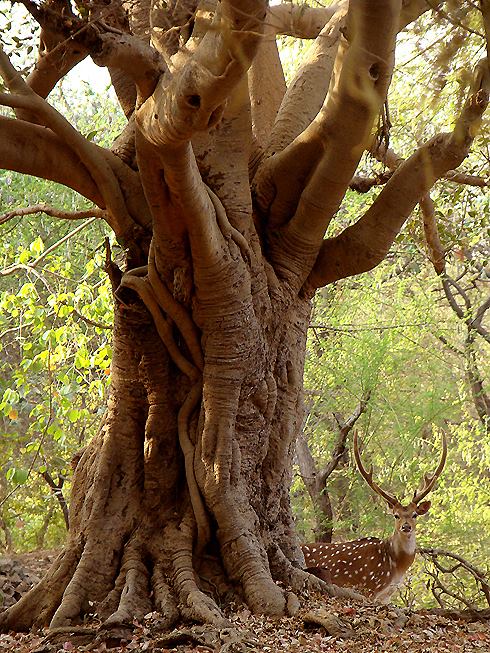 All the other jeeps had already gone ahead. We were the only ones who stopped the vehicle as soon as we entered the park. A Maldhari tribesman had just crossed us when we were about to start the jeep again. But our driver who was a keen observer said he sensed something was near by. Just then, a stag (Male Spotted Deer) on our right gave out a loud alarm call.