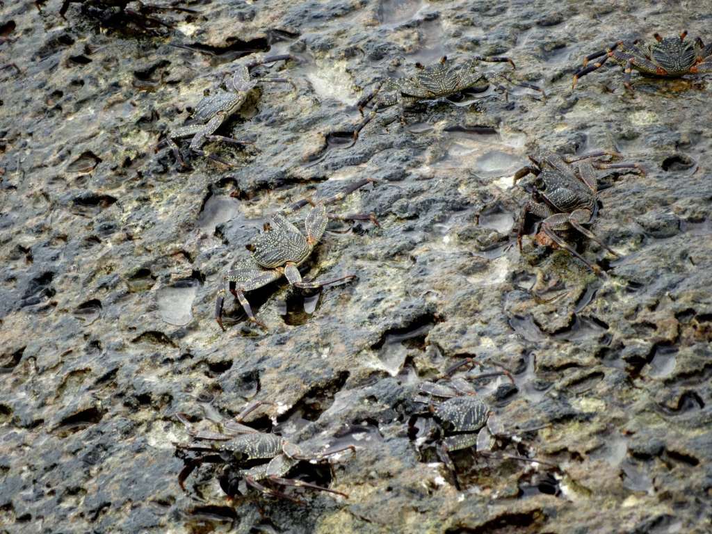 We watched crabs that made their way up the sides of the jetty. They merged so well with the brown stone slabs that sometimes it would create an illusion. Barnacles had taken over most of the rocks below. We sighted some birds like White-bellied Sea Eagle, Pacific Reef Egret, Pacific Golden plover and were itching to go beyond the permitted boundaries to scout the greenery behind for some birds. But we did get lucky for we got to see the uncommon Ashy Minivet, a lifer for me. Though not endemic to the region, the bird is rare in peninsular India. The shallow waters revealed flashes of yellow and black, a school of fish that I had not seen before.