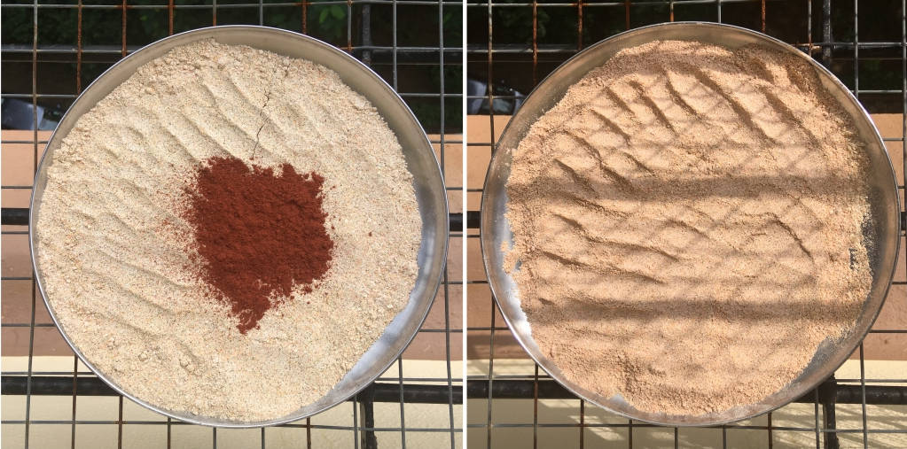I improvised at this stage and added some dried badam skins (which were going to be thrown away otherwise). The badam skins adds more scrub to the mixture.