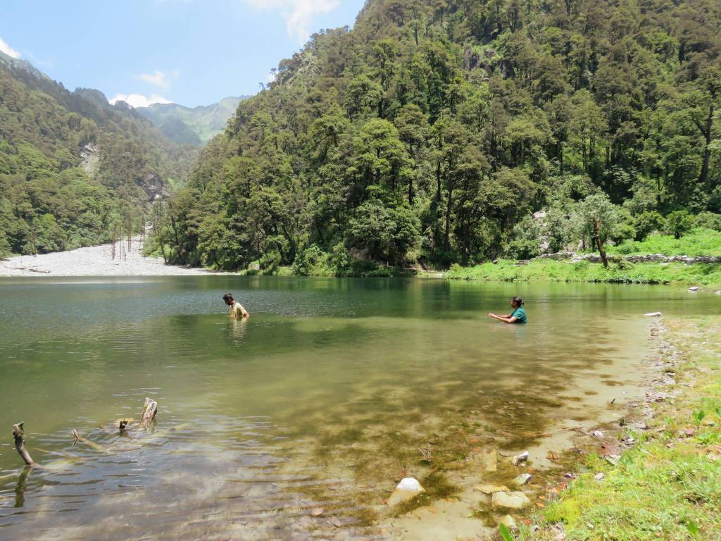 Dodital offers a spectacular view. The lake is set with the background of towering hills covered with dense forest and you can see a mountain stream in the midst of it, which feeds the lake. A walking path exists around the lake which is good for birding and sighting small mammals like the Pika. A temple is located at one side overlooking the lake which has a priest who lives there in the summer. Wooden cabins are spread across the campsite which have basic facilities. Dodital is famous for harbouring Himalayan Trout and some other trout species (fish) which apparently was introduced in the lake several decades ago. Fishing in the lake requires special permit from the Forest Department. Swimming does not need permits but the lake is deep, so non-swimmers should stick to the banks (like I am). Uptil Dodital, is a good walk for beginners.