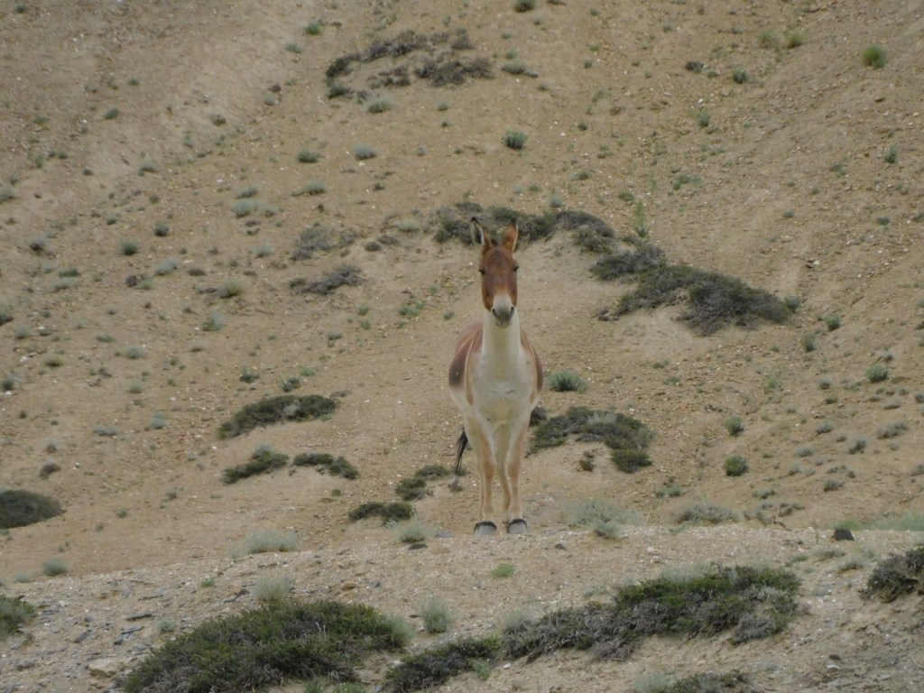 Just above the green hillock on the right side, a Kiang (Tibetan Wild Ass) stands, looking at us!