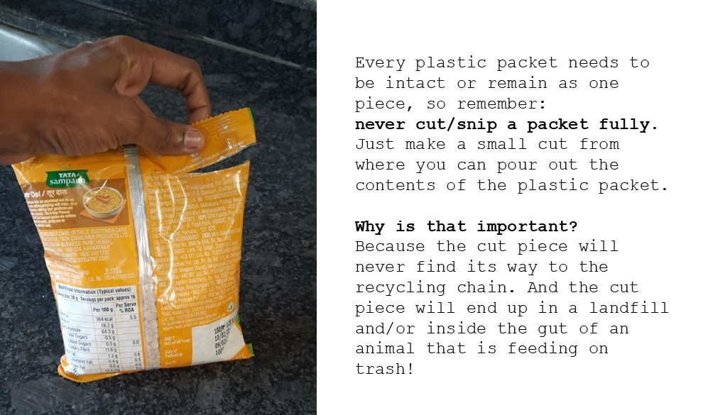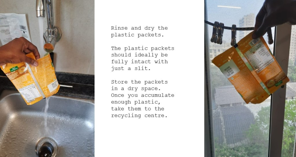 Reduce your plastic waste generation as much as possible. If you have opportunities to reduce the amount of plastic you get into your home, then find out these options. For eg, I always buy unpackaged fruits and vegetables (which is commonly available in Indian markets). If you have the option to buy khula groceries (unpackaged), then go for it. Unfortunately, many items like mushrooms, cherry tomatoes, baby corn, certain fruits tend to come only in packaged forms, which is so disappointing!