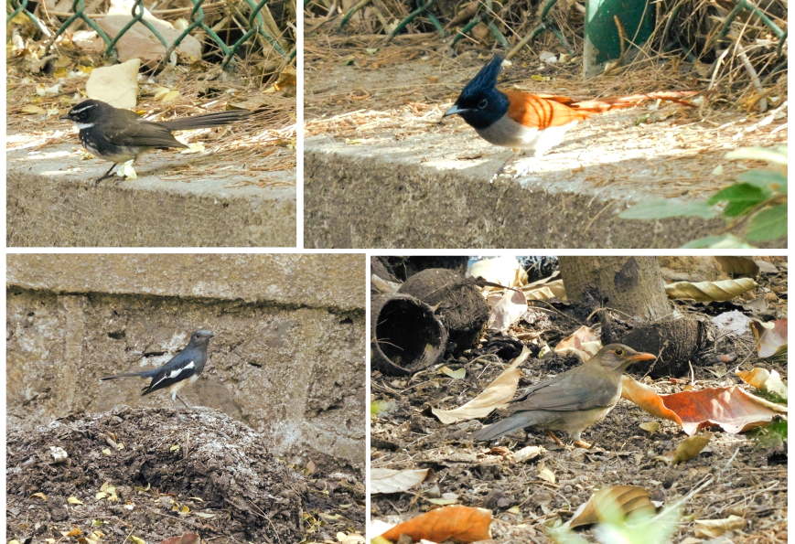 The time was around 10 AM and the chatter of the birds had not died down yet. This was the advantage of the composting site. Small and large insect-feeding birds are seen all day around it. On this particular occasion, I was observing 2 House Mynas, 2 Spot-breasted Fantail Flycatchers, 3 Oriental Magpie Robins, 2, Red-vented Bulbuls, 1 Indian Paradise Flycatcher, 1 Indian Blackbird and 1 Common Tailorbird- all sharing a 6 metres stretch of drying compost patch.