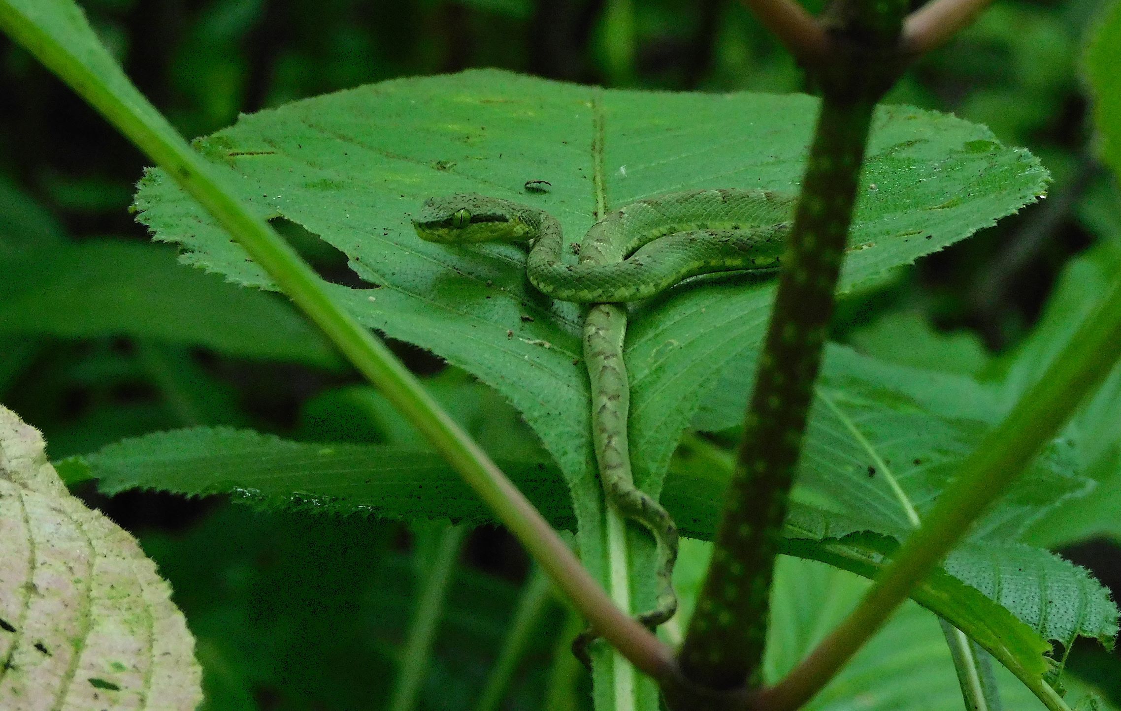 We had recently gone for a local hike around Mumbai. It was afternoon and we were walking back downhill on an unmarked path, heading back to the base village. We had kept forest markers for ourselves so we won’t get lost. As we reached a fork in the path, Ashwin pointed me in the direction I should go, but just as I was about to turn, something caught my eye. A tiny snake was coiled on a leaf, its gaze fixed intently on Ashwin. “Oh!” I gasped, realizing it was a (juvenile) Bamboo Pit Viper. The BPV (C. gramineus) is a common venomous species found in some parts of India. If we hadn’t paused for those brief 10 seconds, we would have surely missed this beautiful creature. It was a lucky moment, and a reminder of how fleeting these encounters can be!