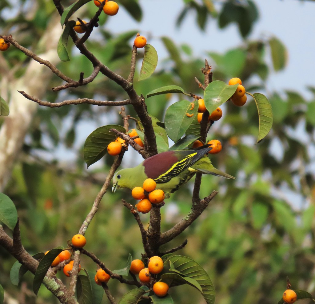 Yellow-footed Green Pigeons jostled for space with Grey-fronted Green Pigeons (formerly Pompadour).
