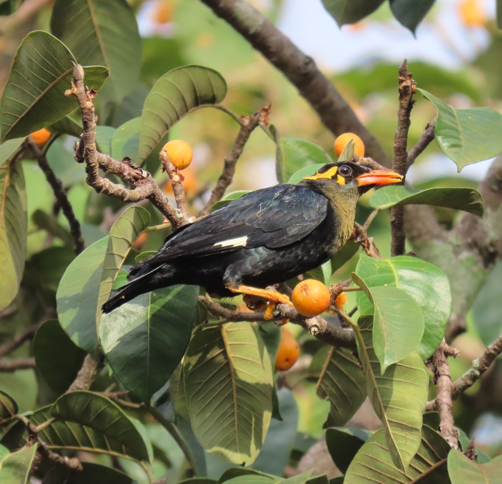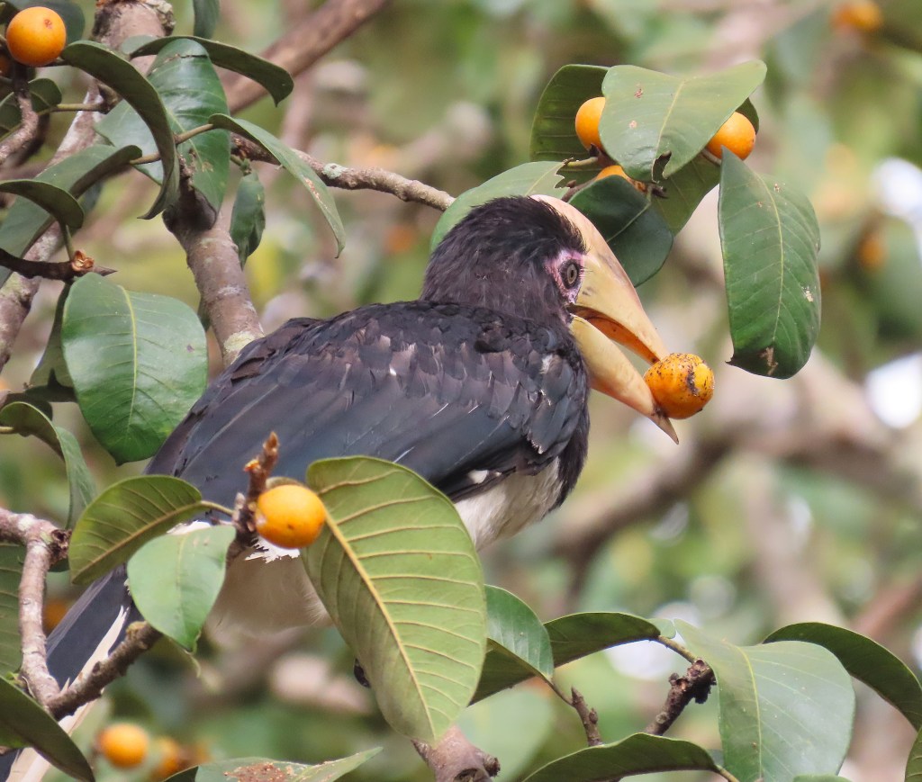 Malabar Pied and Malabar Grey Hornbills were busily plucking figs with their oversized bills—tossing them into the air and swallowing them whole.